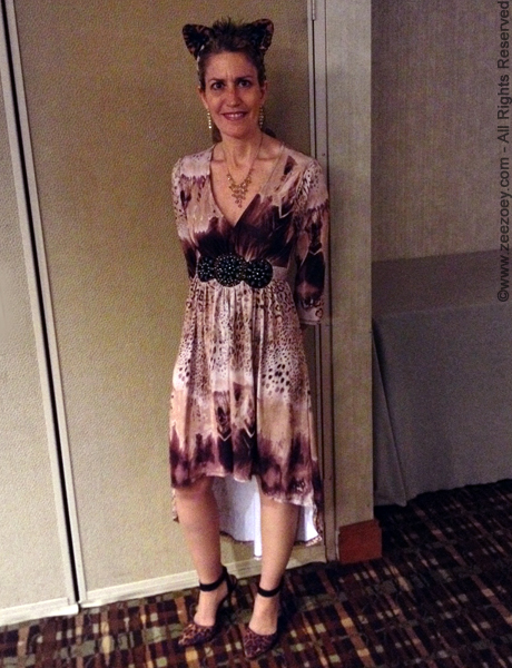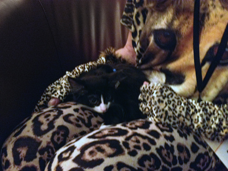I spent the first night with Stoli – one of the rescue kittens Jeanne Kudich of Random Felines brought to the event (despite that you can’t see my face, clearly with the leopard garb, who else could it be?) While it doesn’t look it from this picture, I was actually able to calm him down and he napped in my lap for quite a while among the dogs and chaos on the premises!