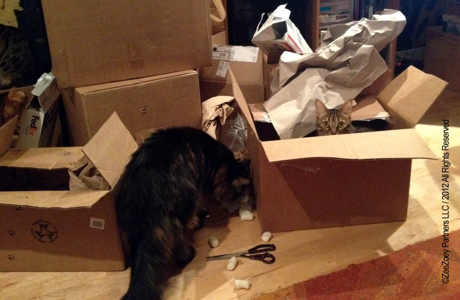 Lovely, just lovely… I turn my back for one second and look what happened. All the mystery boxes that nobody seems to know anything about that I was going to return, have been OPENED by the cats and they have made a HUGE mess! Not to mention, they have been using my scissors again which I have told them over and over, they are not allowed to do…