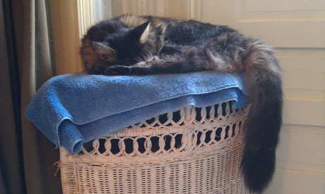 Sunday, June 26, 2011. 9:46 a.m. The creature is discovered, apparently sleeping atop some sort of domesticated wicker hamper with a padded towel for maximum napping comfort