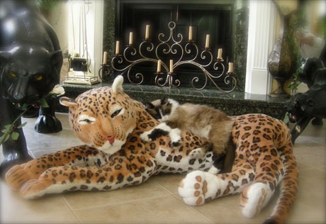 I just love this picture of our beautiful Ragdoll cat, Mr. Jazz, as he so casually takes a catnap on a life size plush leopard that we have in our dining room, as if it is the most natural and normal thing in the world! Actually though, for our household, that is the most normal thing in the world!