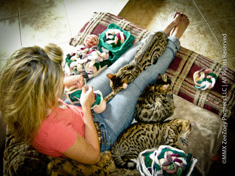Me, crocheting on the couch – the kittens are approximately 6 months old – Mia stretched on my legs, Peanut snuggled by my knee, and Rolz sleeping by my hip