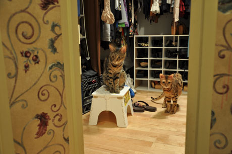 Over the past weekend Dan and I had been doing some home renovation projects. We are redesigning a guest bedroom we have and are down to all the fun little details like decorating and accessorizing. Dan was in the process of painting a very tall, VERTICAL column that stores books and cds. Well, any of you that watches My Cat from Hell with Jackson Galaxy, knows that cats instinctively LOVE “vertical space.” So, when I heard Dan yelling, first at Mia, then a half hour later at Peanut, then minutes later at Zoey, and minutes after that, Rolz, I knew Jackson would be very proud of my cats. Dan, not so much. No matter how many times he yelled, they did not understand that he was yelling at them to NOT jump up to a tall, VERTICAL space while he was swishing a paint brush up and down like a playful invitation to a game of bat and swat. What is wrong with these cats? Don’t they know they are jumping up to wet paint???