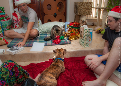 This is my grand-dog, Rick, who was visiting for the Christmas holidays. You will note my cats Kizmet and Rolz also in the picture – they are perfectly at ease with Rick because I took my time introducing him to them and they also have a cat condo behind them if they feel the need to take high cover.