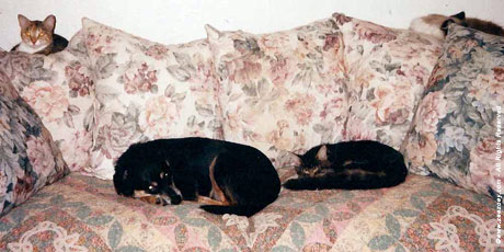 When this picture was taken back in 1998, our household had 4 cats and 2 dogs. The secret to making it all work was the gradual, supervised introductions to one another. Seen here is Jazz as a kitten who was meeting Bandit and Bailey for the first time.