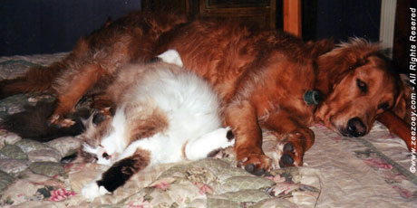 A picture is worth a thousand words and nothing conveys the love between cat and dog better than this one of Jazz sharing a nap with our rescue golden retriever, Lexi. Lexi came after Jazz, but the slow, gradual introduction phase between a multi-pet family is critical regardless of who comes first! This picture was taken in 2001.