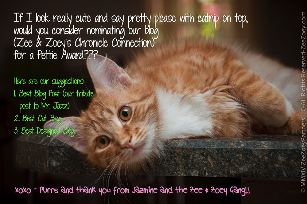 I truly don’t like asking because it really is such a long process and every year I debate if I want to participate. But, the fact of the matter is, if Zee & Zoey’s blog wins an award, we will get a $1,000 donation for a shelter or rescue of our choice and that’s not something we can let pass by. We would donate the money in honor of Mr. Jazz to our favorite organization, Pawsitively Humane, Inc. that was founded by our dear friend and animal lover, Christine Michaels of Riverfront Cats.