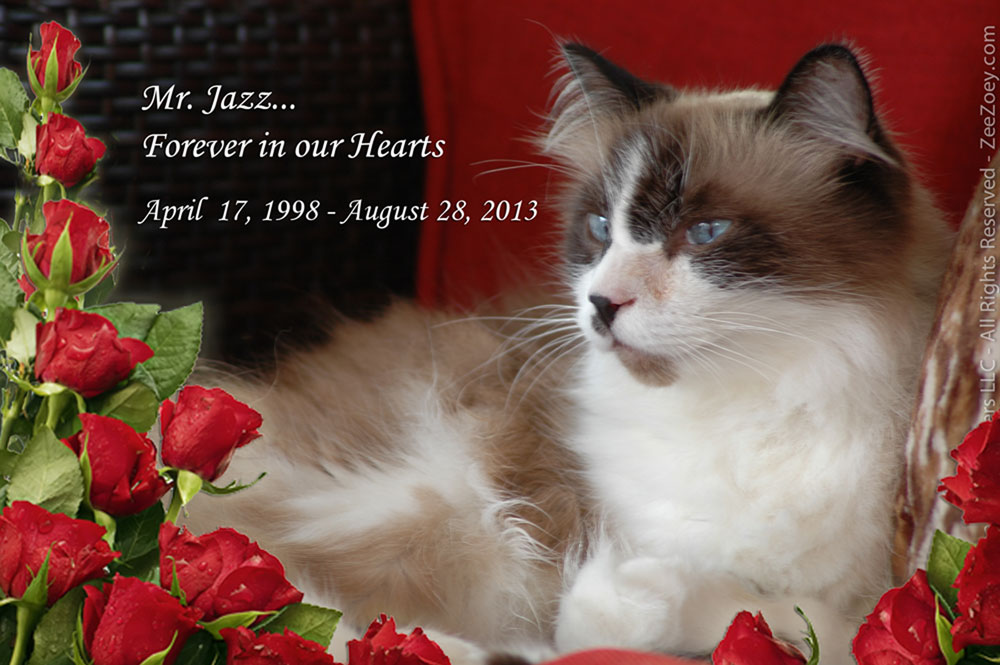 Jazz was born on April 17th in 1998 and came to live with me in July of the same year. While he was a pedigreed cat, I did not get him for his background and I never paid attention to his lineage papers. I filed them away years ago, never giving them a second thought. His name, Jazz (aka Jazzy and Mr. Jazz), came to me several weeks after he lived with us as a result of his happy personality which reminded me of jazz music.