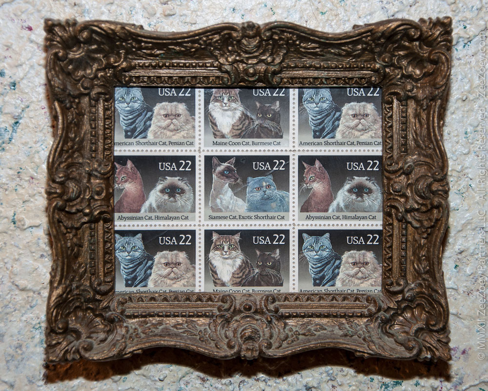 I also loved having the option of choosing a book of stamps with artwork that commemorated something going on in the world. One of my favorites was the recent series of cats and dogs called “Animal Rescue Adopt a Shelter Pet” when stamps were still 44 cents and I also have a series of charming cat stamps that I framed almost thirty years ago that now hangs in our guest bathroom. Somehow this silly sheet of nondescript stamps made me both sad and angry as I realized with more certainty than ever, that the post office is going the same route as newspapers, film, books, and magazines – digital and electronic.