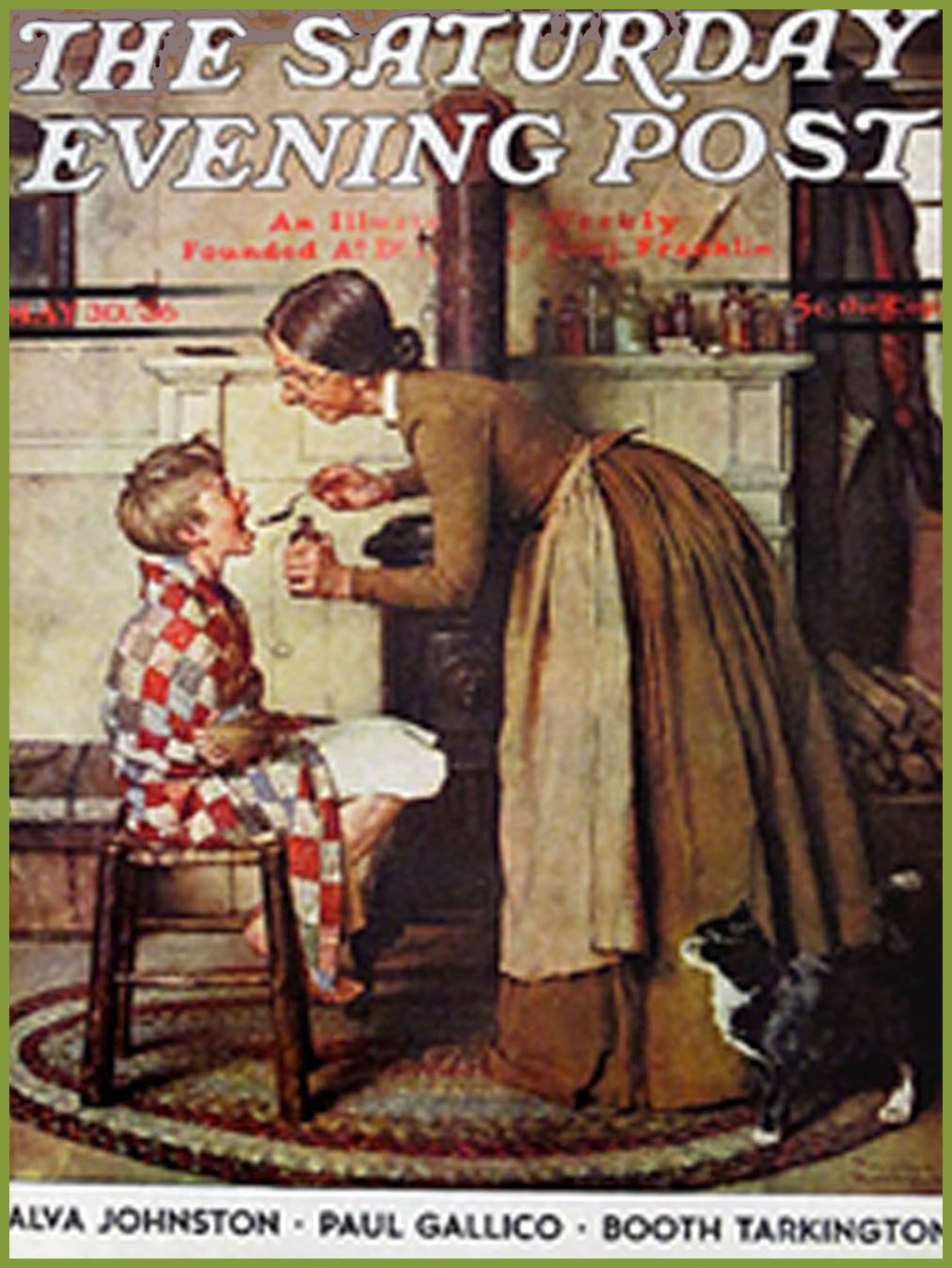 Numerous illustrations of Norman Rockwell graced the cover of the classic magazine, The Saturday Evening Post. This one, called “Take Your Medicine,” from May 30, 1936 actually features a cat in the corner. This was somewhat unique, as Rockwell tended to use dogs in most of his works.