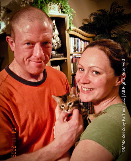 Week 8 with the kittens was a pivotal time for all of us – exciting, but bittersweet at the same time. By now, each kitten was emerging with a distinct personality and we could actually tell who was who (sort of). They had gone to the vet for the first time to get their shots and a health check-up and it was confirmed that we did indeed have two males and two females as we had suspected. All of them had permanent names now– Rolz was our big boy who was named after his tendency to roll on his back, combined with the clever usage of the letter “z.” Peanut was the runt (at the time) of the litter and so that’s why she got that name. Mia was the other female and was such an exquisite looking creature, that we felt the name gave her perfect justice – very feminine and exotic sounding. The last kitten, who was a male, was already claimed by Dan’s daughter Crystal and her then boyfriend, Sean. They both lived in Boston and fell in love with him via email pictures we would send them and planned on adopting him. Before even meeting him in person, they chose the name “Zeuss,” feeling it was the perfect name to keep the legacy of the letter “Z” and the character of a strong and powerful personality that originated from Greek mythology.