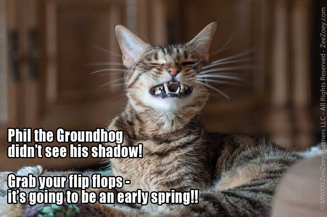 Well, as per the usual tradition of Groundhogs Day on February 2nd, Phil the Groundhog from Punxsutawney, PA is supposed to emerge from his burrow to predict whether or not we will have an early spring or if winter will stretch on until mid-March. The answer is based on hard, scientific evidence, i.e., whether or not he sees his shadow, and it’s a ritual that has been going on since 1887. The gist of it is simple – if he sees his shadow, we are in store for another 6 weeks of winter, if not, time to put the snow shovels away and break the sandals out! Naturally this was of extreme interest to our cats and they ran to the front window and waited with bated breath to see the outcome.