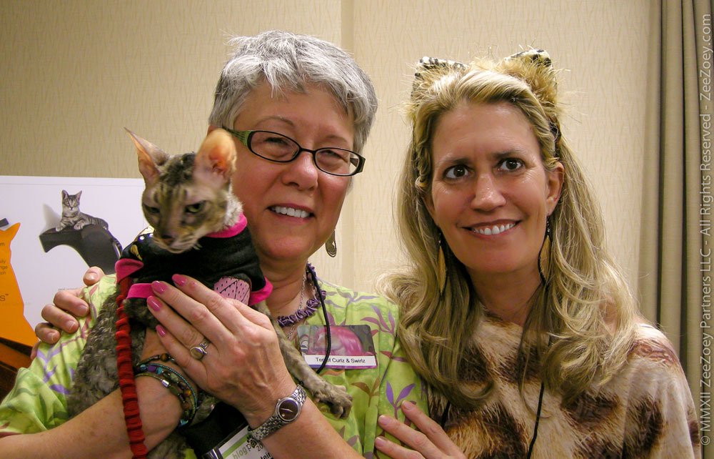 Nothing unusal here... me in ears with Teri of Curl and Swirlz and her cat Coco who is wearing a designer outfit... I was thrilled to meet up with Teri after doing that great interview with her on breeding Cornish Rex cats.