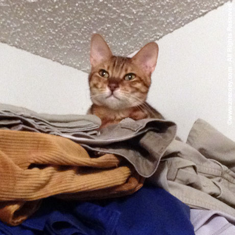Up here! Can you see me? I’m sitting on human Dad’s clothes! He doesn’t like me up here so please don’t tell on me!